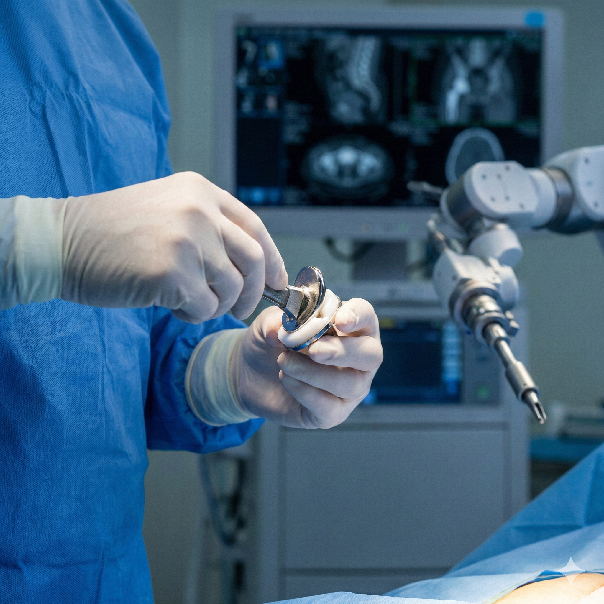 Advanced prosthetic components — femoral stem, ball, and acetabular cup — are securely placed for optimal joint stability and function.
